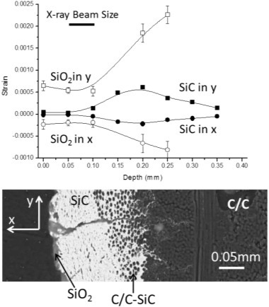 As reported in a new article[1], researchers from the Australian Dept. of Defense (DST Group, Aerospace Division), lead by first author John Thornton, have used high energy x-rays at CHESS to map depth-dependent phase and strain in several samples of C/C which have been coated with sodium silicate glass and silicon carbide. They investigated both “pristine” samples, as well as samples which had been blasted using an oxy-acetylene torch to simulate operating conditions. Mismatch in thermal contraction of coating and C/C results in through-thickness cracks of the SiC layer which must be filled using sodium silicate glass. The degree of oxidation of the coating was shown to effectively tune this strain mismatch, as was the degree to which the interface is compositionally graded. The detailed understanding of the strains present in each phase, as a function of depth, allowed Thornton and colleagues to propose ways to improve oxidation resistance in the future, by introducing a composition-graded buffer layer of graphite between the C/C and the SiC. This should reduce the tensile strain, and thus also reduce the density of through thickness cracks.