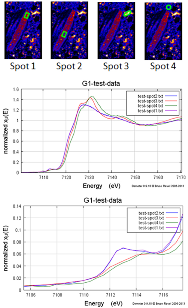 Figure 1 shows an XRF maps (top pane) of a large clast within the impact breccia taken with an x-ray excitation energy above the iron K-edge (7.112 keV) with a spatial resolution of 40 um. Full range XANES mapping, from 7.05 keV to 7.3 keV, was performed on the entire area, 3.6mm x 5.5mm, of the XRF map with an integration time of 15 ms per pixel, taking less than 8 hrs to produce the entire XANES image stack. XANES spectra extracted from different spots inside the clast and in the breccia matrix are shown in the graphs of Figure 1. From XANES extracted at different spots within the clast (spot 1&2) we can see that iron exhibits a homogenous phase distribution across the clast. It is clear from the XANES that iron in the host matrix (spot 3&4) exhibits a different phase than iron within the clast (spot 1&2).