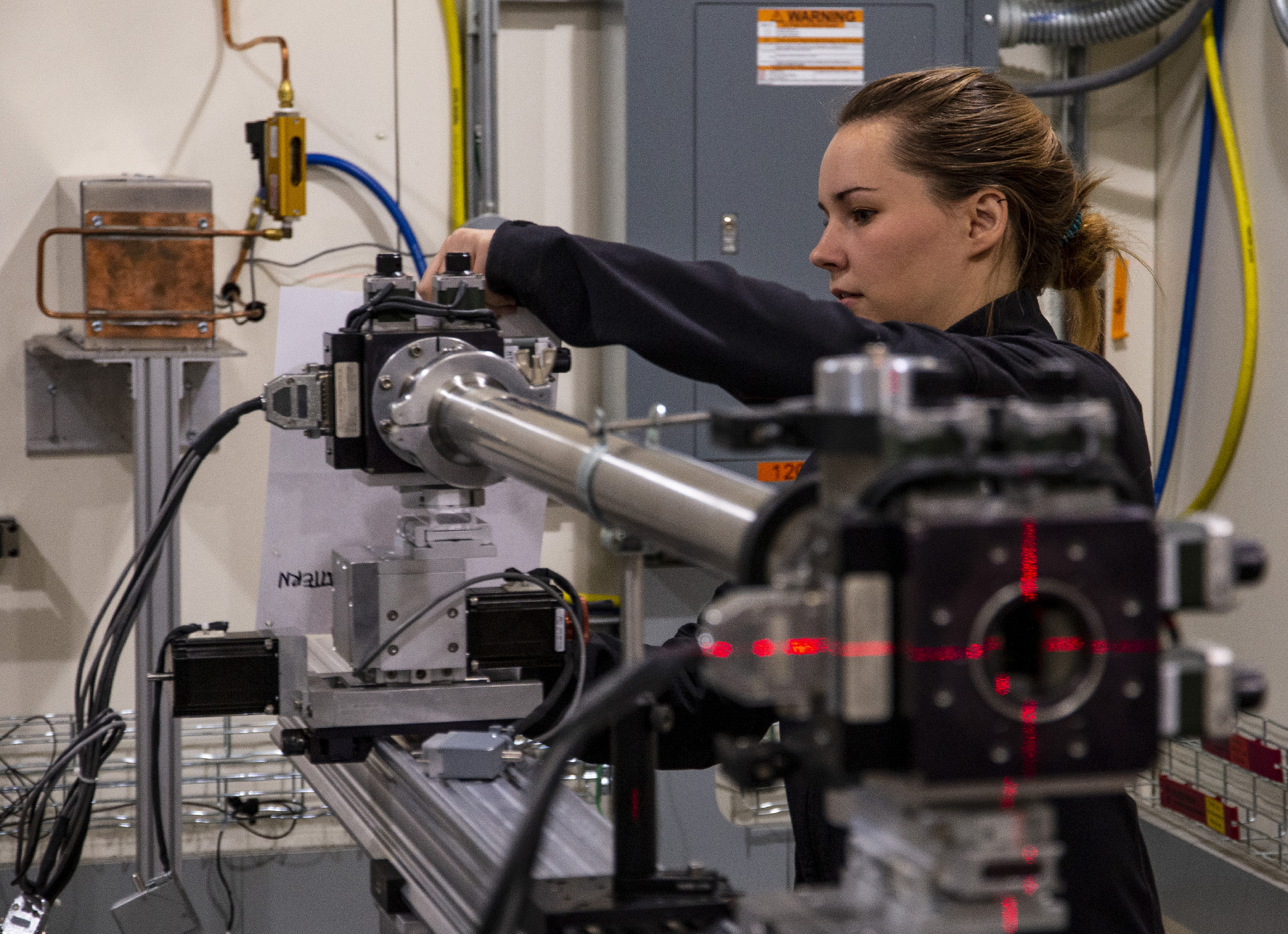Louise Debefve stands outside a hutch on the experimental floor of the Cornell High Energy Synchrotron Source, CHESS. She is preparing the experimental equipment for some of the first data to be collected at CHESS since the completion of the CHESS-U upgrade.